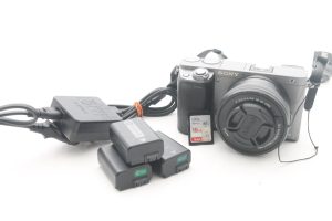Sony mirrorless A6000 (crop) + 16-50mm f3.5-5.6 OSS (stabilizer), memory 16GB, bateri x3, charger dan beg. Sangat sesuai untuk shoot video & slow motion. Video 1080HD, internal mic, Boleh shoot video panjang sebab boleh guna powerbank.