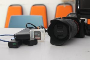 Sony mirrorless A7 (fullframe) + 28-70mm f3.5-5.6 OSS (stabilizer), memory 16GB, bateri x3, charger dan beg. Sesuai untuk shoot photo & video full HD. Ada ext port mic & port headphone.